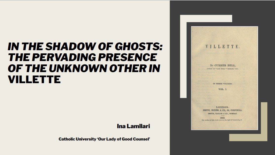 L’articolo di Ina Lamllari, dal titolo “In the Shadow of Ghosts: The Pervading Presence of the Unknown Other in Villette”, presentato al Convegno Fourth Alumni Research Conference on Linguistics, Literature, Didactics and Communication (AAB College, Prishtina, 1° novembre 2025), propone un’analisi letteraria del romanzo Villette di Charlotte Brontë. Il contributo indaga la presenza costante dell’“Altro” sconosciuto come elemento simbolico e narrativo, soffermandosi sui temi dell’alterità, dell’identità e dell’inquietudine psicologica. Attraverso un approccio critico e interpretativo, l’articolo evidenzia come la dimensione del perturbante e del non detto contribuisca alla costruzione dell’atmosfera del romanzo e alla complessità dei personaggi, offrendo una lettura attenta alle dinamiche culturali e interiori del testo. (Articolo in fase di pubblicazione negli Atti del Convegno).
